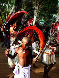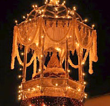 Next, the four Devales parade in succession, starting with the Natha Devale. Next comes the Vishnu Devale which is dedicated to the Hindu god, Vishnu. Then comes the Kataragama Devale which is dedicated to the God of Kataragama who is identified with the warrior god Skanda. This procession includes Kavadi, the peacock dance, in which the pilgrim-dances carry semicircular wooden contraptions studded with peacock feathers on their shoulders.