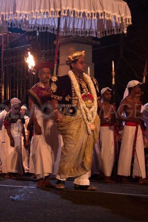 A group of singers dressed in white heralds the arrival of the Maligawa Tusker carrying the Sacred Tooth Relic. The Diyawadana Nilame (traditionally required to do everything in his power to ensure rain in the correct season) walks in traditional Kandyan-clothed splendor after the tusker.